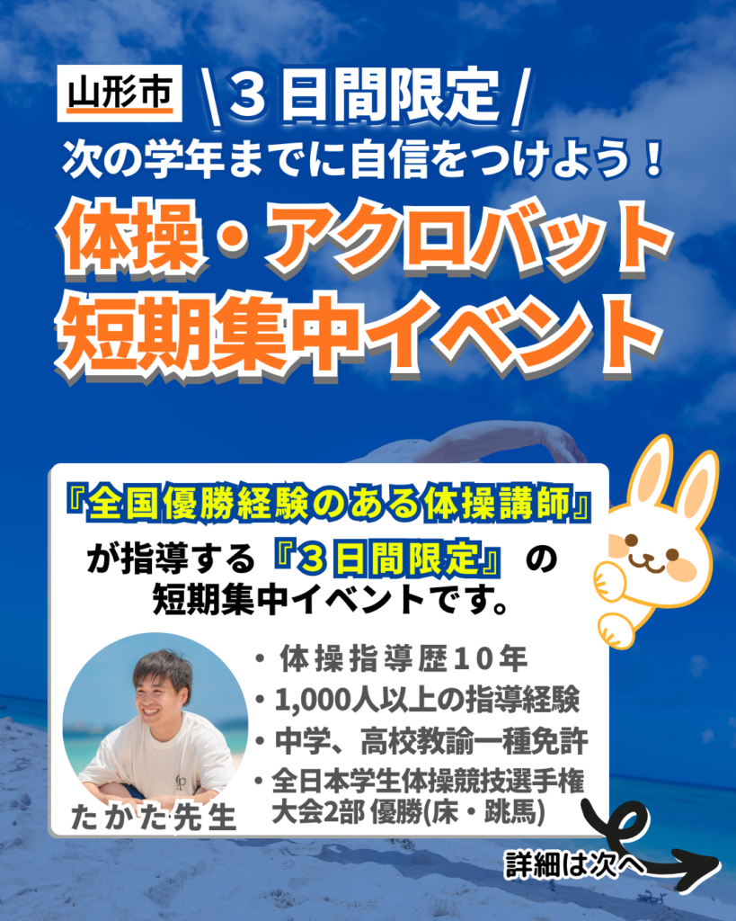 \東北の"楽しい!"がここに集まる!/ 東北イベント情報 東北の"楽しい!"がここに集まる! 東北イベント情報 東北で開催される様々なイベント情報をまとめて紹介するサイトです。お祭りやフェス、スポーツイベント、体験イベント、親子で楽しめるイベントなど、東北の魅力あふれるイベントを幅広く掲載しています。東北の“楽しい”を、ぜひ見つけてください。 無料で掲載 Sports Event 2026/3/20(金)~3/22(日) NPO法人とっちスポーツクラブ 山形イベント Yamagata Event Sports Event 通年開催 有料 出張個人レッスン NPO法人とっちスポーツクラブ Sports Event 4月開催 無料 アクロバット出張指導 NPO法人とっちスポーツクラブ Sports Event 3月開催 有料 体操・アクロバットイベント NPO法人とっちスポーツクラブ Sports Event 2月終了 無料 村山地域こども体操イベント NPO法人とっちスポーツクラブ 山形イベントをもっとみる 宮城イベント Miyagi Event Sports Event 通年開催 有料 出張個人レッスン NPO法人とっちスポーツクラブ Sports Event 4月開催 無料 出張ワークショップ NPO法人とっちスポーツクラブ 宮城イベントをもっとみる 福島イベント Fukushima Event Sports Event 通年開催 有料 出張個人レッスン NPO法人とっちスポーツクラブ 福島イベントをもっとみる 秋田イベント Akita Event Sports Event 通年開催 有料 出張個人レッスン NPO法人とっちスポーツクラブ 秋田イベントをもっとみる 岩手イベント Iwate Event Sports Event 通年開催 有料 出張個人レッスン NPO法人とっちスポーツクラブ 岩手イベントをもっとみる 青森イベント Aomori Event Sports Event 通年開催 有料 出張個人レッスン NPO法人とっちスポーツクラブ 青森イベントをもっとみる