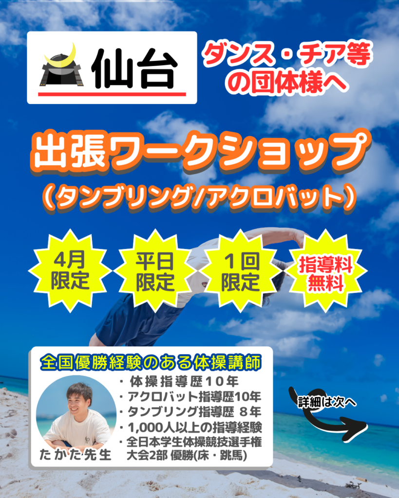 「仙台の子供たちに体操の楽しさを届けたい!」をテーマにダンスやチアの団体向けの出張ワークショップです!